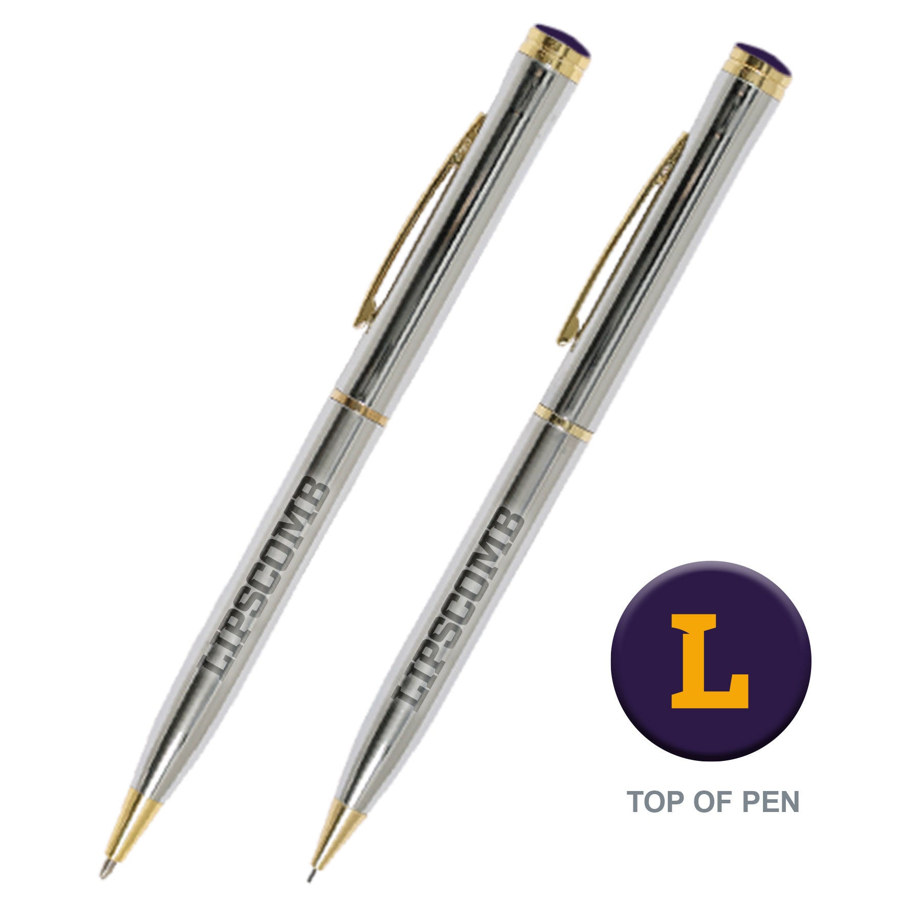 Twist-action ballpoint pen and twist-action mechanical pencil. Medium point pen with black ink. 0.7mm fine point pencil with eraser. Full-color graphic on top and laser graphic on the barrel. Individually gift boxed. Peggable.